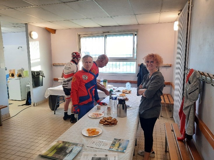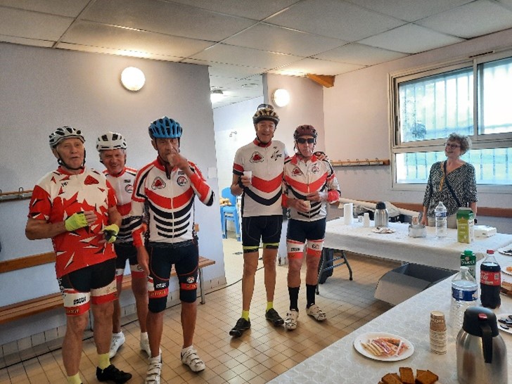 | Pratique le mur pour poser les vélos … | 11h 30, les premiers sont déjà revenus | Alain et Philippe s’occupent des choses sérieuses ! | Pour Revel, le réconfort après l’effort. |